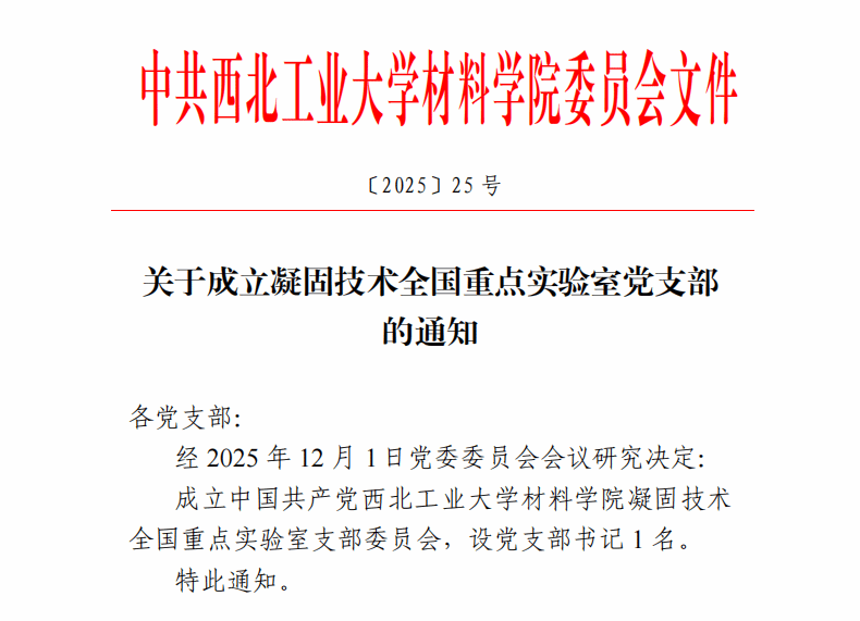 为深入贯彻落实新时代党的建设总要求,切实加强基层党组织建设,经中共西北工业大学材料学院党委批准,凝固技术全国重点实验室党支部于2025年正式成立。这标志着实验室在坚持和加强党的全面领导、推动党建工作与科研业务深度融合方面迈出了关键一步。