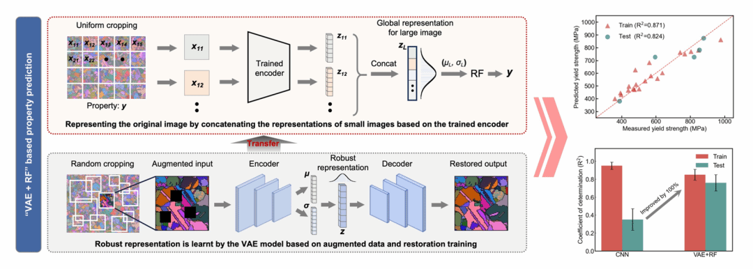 针对组织-性能关系模型的建立,一般采用深度学习自动化提取图像特征并预测目标性能。但是,微观组织蕴含丰富的物理信息,如何有效提取这些信息并进行量化表示,是建立兼具解释与预测能力构效关系的关键和难点。值得注意的是,实验研究中可利用的数据通常很有限,进一步凸显了解决上述两个问题的迫切性。针对上述问题,发展了基于变分自编码器的自监督编码技术,通过图像增强和两步训练策略,提取了微观组织关键信息并实现了更具泛化能力的编码表示,随后以编码表示作为输入预测了屈服强度。相对于经典CNN模型,新开发模型在测试集上的预测精度明显提升。更有趣的是,潜变量表示-屈服强度关系与霍尔-佩奇规律类似。进一步分析表明,特定维度的潜变量可以直接表示或对应小尺寸晶粒,即模型具有较好的潜变量解耦能力。