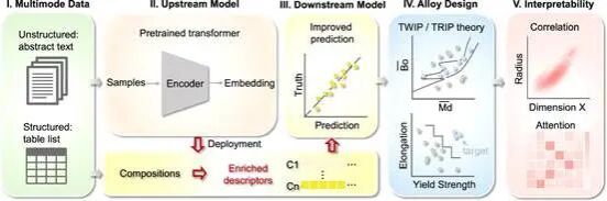 针对成分-工艺-性能关系模型的建立,一般以不同构成元素的含量或者基于专家知识构建的物理描述符作为输入去预测性能。但是,这类数值型参量是否蕴含足够的信息量,能否充分地描述给定合金?更重要的是,物理描述符设计严重依赖于专家经验和材料体系,有可能导致普适性不足。针对上述问题,发展了基于Transformer的多模态数据融合方法,通过从5万篇文献摘要蒸馏知识并迁移至小样本数据,自动获取了材料成分的高质量表示。相对于成分和物理描述符作为输入,提升了多种力学性能的预测精度。进一步分析发现,基于多模态数据融合的成分表示,向量的某些维度与物理描述符呈现强线性相关性,表明模型有效学习到了文献中蕴含的知识或物理信息。在预测模型的基础上,结合多目标优化算法,推荐了强塑性协同的新型钛合金。