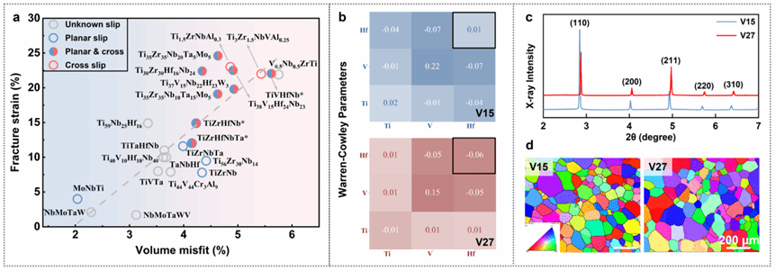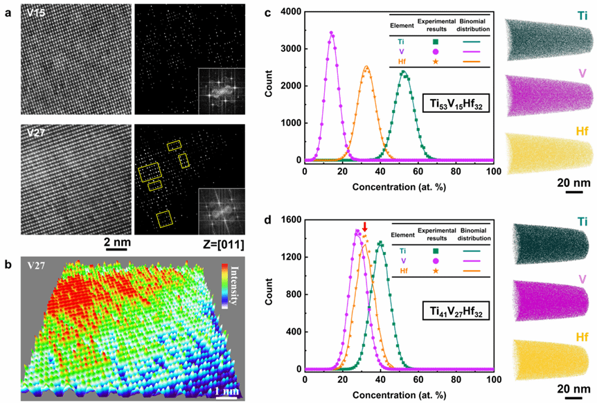 团队以铸态Ti-V-Hf 体系为模型合金,通过调控晶格畸变(以原子体积错配δv量化)和化学成分起伏(以Warren-Cowley参数表征),设计出两种难熔多主元合金(图1):V15(Ti53V15Hf32):δv=5.3%,合金内原子呈随机分布特征;V27(Ti41V27Hf32):δv=6.1%,存在显著化学成分起伏(图2)。