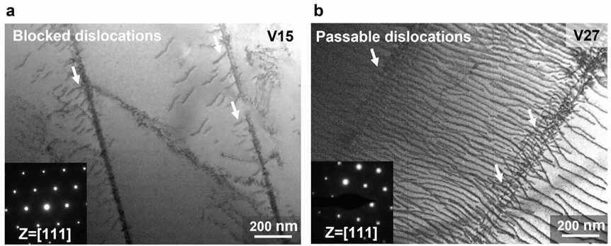 图4通过对V15与V27合金变形行为的表征证实,位错滑移是二者共同的主导塑性变形方式。差异在于,V15合金中位错主要以平面滑移带形式分布,大量位错易在滑移带内发生塞积并受阻,难以继续运动,导致合金的应变硬化能力快速饱和,无法支撑后续塑性变形;而V27合金中则形成了河流状位错通道,位错在通道壁处无明显塞积现象,利于合金实现持续塑性变形。