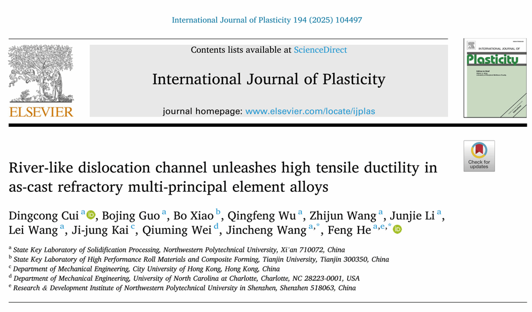 回溯上古时期,大禹治水时摒弃“堵截”之法、改用“疏导”策略,引洪水入江河以平九州水患,这一蕴含东方智慧的治水理念跨越千年时空,为材料科学研究提供了创新灵感。西北工业大学王锦程教授团队受此启发,创新性提出“堵疏结合”的位错工程新策略——通过在铸态难熔多主元合金(RMPEAs)中构建河流状位错通道,既以通道边界“筑坝”保障强度,又借通道内交滑移“分流”促进塑性变形均匀化,最终成功实现了合金强度与延性的协同提升。研究成果以“River-like dislocation channel unleashes high tensile ductility in as-cast refractory multi-principal element alloys”为题发表在International Journal of Plasticity上。论文第一作者为博士研究生崔丁聪,通讯作者为王锦程教授和何峰教授,西北工业大学凝固技术全国重点实验室为通讯单位。