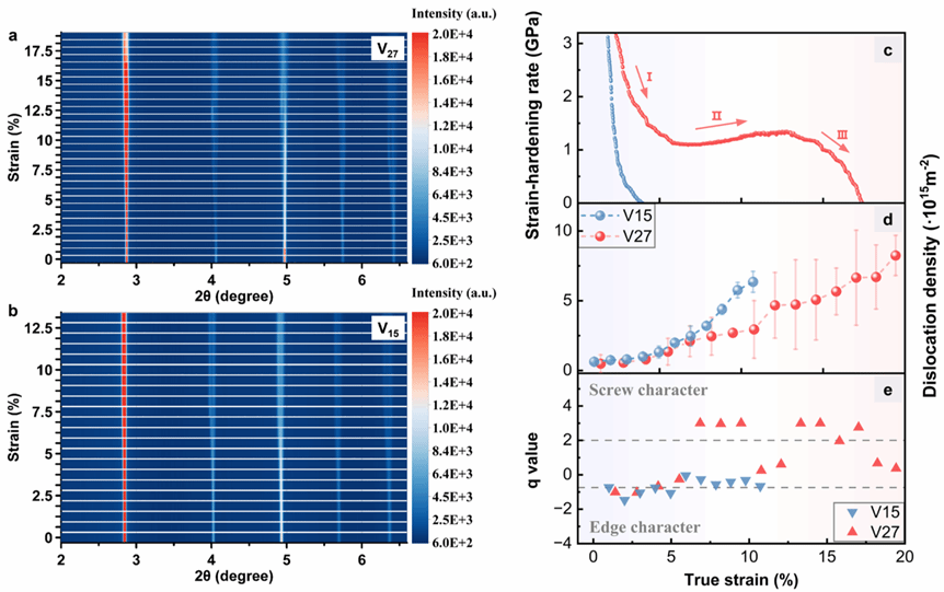 图5所示原位同步辐射高能X射线衍射(Synchrotron HE-XRD)结果表明,两种合金在整个拉伸过程中,除体心立方(BCC)相的特征衍射峰外无其他额外衍射峰产生,未伴随相变或孪生过程,从而排除了非位错机制对塑性变形的干扰。其次,应变硬化率(SHR)曲线显示V15的SHR呈单调下降,而V27的SHR呈现“先快速下降-再稳定上升-后缓慢下降”的三阶段特征,其中第二阶段(应变6%~13%)的SHR持续上升,为合金维持高延性提供了关键支撑。通过卷积全谱拟合(CMWP)法分析XRD数据得:V15位错密度在变形初期便快速增长至6.36×10¹⁵ m⁻²并进入饱和状态;而V27位错密度则随变形持续增长,直至断裂前达到8.24×10¹⁵ m⁻²。此外,位错特征参数q演化结果显示:V15始终在整个变形过程中始终以刃型位错为主,位错运动易受平面滑移限制;而V27则从变形初期的刃型主导,逐渐转变为中后期的螺型位错主导,助力交滑移和位错通道的形成。
