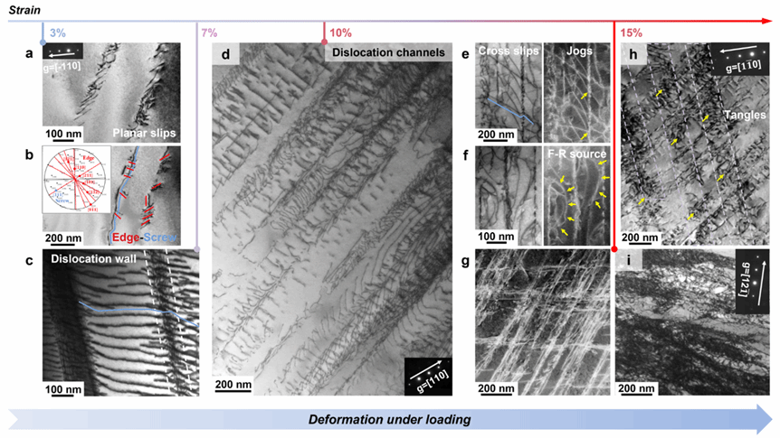 3%应变:位错运动以平面滑移为主,由刃位错排列和长直螺位错逐渐构成位错壁;其中,刃位错与螺位错作用形成的弯结可沿滑移方向运动,有效维持塑性流动。