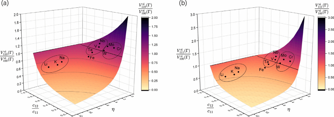 图1. 典型bcc金属中的非解析性关键参数与弹性各向异性(η)和c12/c11 的关系