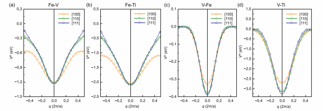 图2. 利用第一性原理计算的(a) Fe-V、(b) Fe-Ti、(c) V-Fe和(d) V-Ti合金的应变诱导相互作用和非解析性。