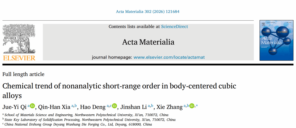 成果以“Chemical trend of nonanalytic short-range order in body-centered cubic alloys”为题发表在金属材料顶级期刊《Acta Materialia》上。论文的第一作者是西北工业大学材料学院本科生漆珏屹,通讯作者是西北工业大学张燮教授、李金山教授等。