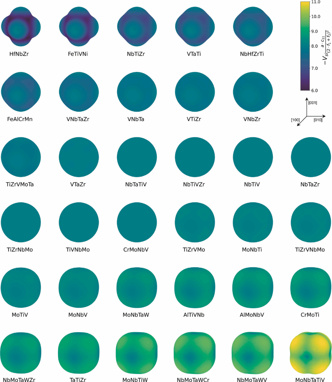 图3. 多种体心立方中高熵合金在Γ点处应变诱导相互作用的取向依赖性。