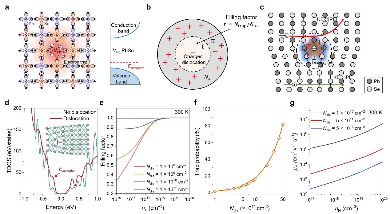 图1. 带电位错的理论模型。a. 带电位错捕获电子的示意图。b. 带正电屏蔽区域的形成。c. 带电位错引起的库仑散射机制。d. 计算得到的不含位错(灰色线)和含位错(红色线)PbSe的态密度。插图:优化后含位错的PbSe模型。e. 不同位错密度(Ndis)下,电子沿位错线的填充比例随载流子浓度(nH)的变化关系。f.电子捕获概率随位错密度的变化关系。g. 位错散射的霍尔迁移率随载流子浓度(nH)的变化关系。
