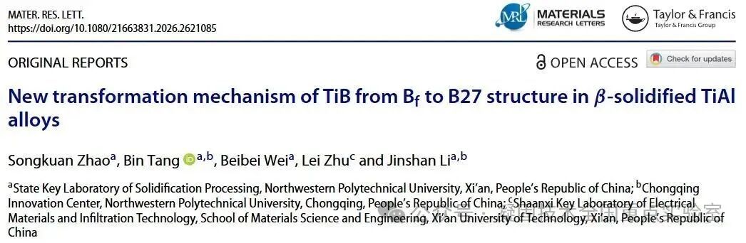 New transformation mechanism of TiB from Bf to B27 structure in β-solidified TiAl alloys,Songkuan Zhao, Bin Tang , Beibei Wei, Lei Zhu and Jinshan Li
